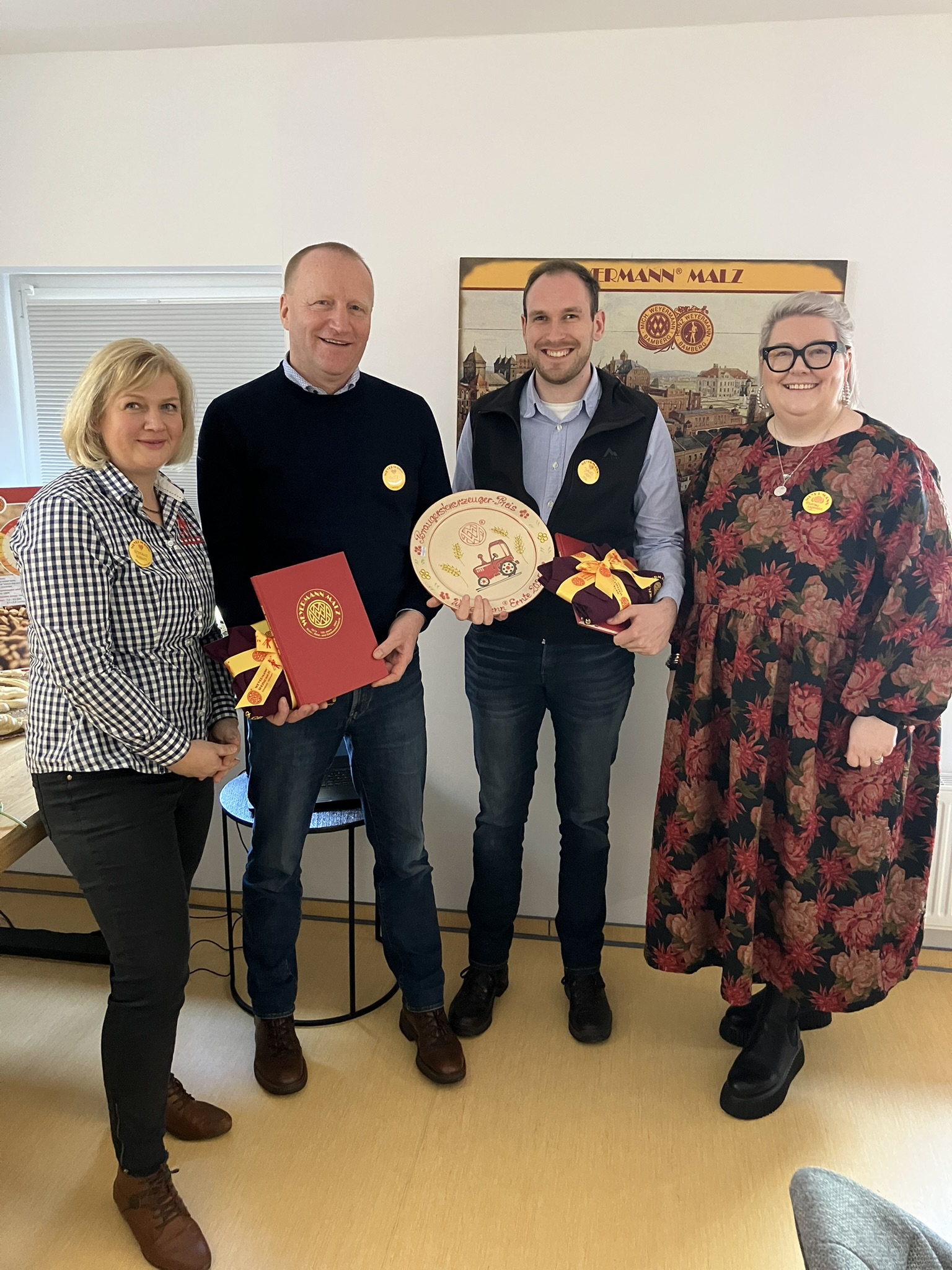 Auf dem Bild sind von links nach rechts Frau Stefani Augner (Weyermann Clingen), Herr Götz Eckardt (EZG Braugetreide Mittelsachsen w.V.), Herr Daniel Probst (BEGA Gahlenz e.G.) und Frau Fransika Weyermann (Geschäftsführung Weryermann Malz) bei der Übergabe des Preises  zu sehen.